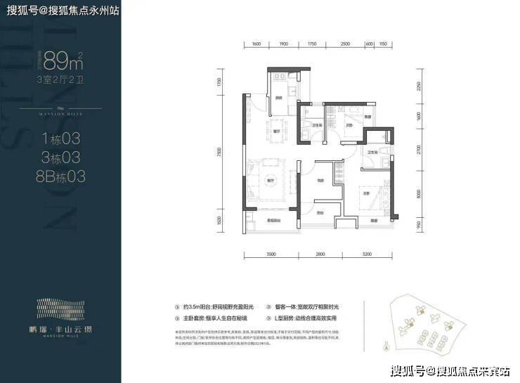 03户型:89㎡的3房2卫,设计的经典竖厅格局,客厅3.5米开间,三开间朝南,L型厨房,3个卧室做到了2.5/2.8/3.2米的宽度,都是东南朝向