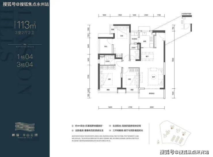04户型:113㎡的4房2卫,设计的是竖厅格局,客厅4米开间,三开间朝南,L型厨房,厨房带1个生活阳台,4个卧室做到了2.7/2.6/3.1/3.6米的宽度,都是东南朝向。