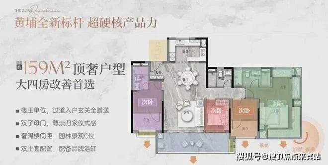 保利招商华发中央公馆采用了围合式设计,6栋47层高塔楼设计,小区自身配建有文化体育场馆和幼儿园,除了2#楼王是两梯四户,其余均为三梯六户。