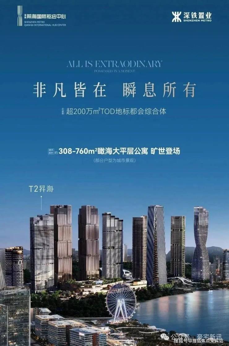 深铁前海国际枢纽中心首发T2 昇海,建面约308-760㎡瞰海大平层公寓,外立面取意风生水起之形,昂扬非凡人生格调,以全套房空间设计、IMAX环幕海景(部分户型为城市景观)、奢感公区配套,映照塔尖人物的生活尊崇。