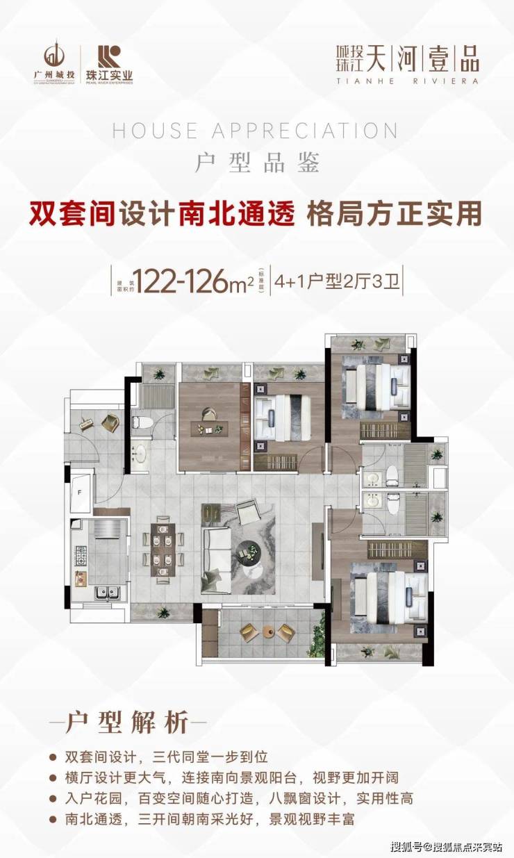 建面120平4+1房,入户处多了一个灵动空间,可改成5房,四开间朝南,全屋大飘窗设计,5.7米观景大阳台