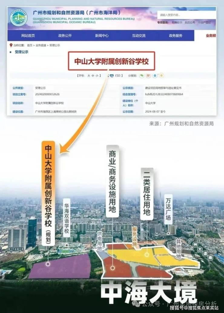 项目西侧教育用地确定规划为中山大学附属创新谷学校,拟定建设总规模为90个班(一个托儿所一个12班幼儿园、一个18班小学和一个72班完全中学),预计2025年12月动工,2027年建成投入使用,中学要摇号。