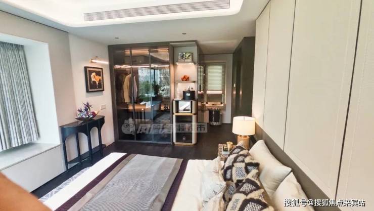 主卧同样是一个带有270°L型飘窗的套间,并且配备步入式衣帽间,独立卫浴,