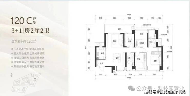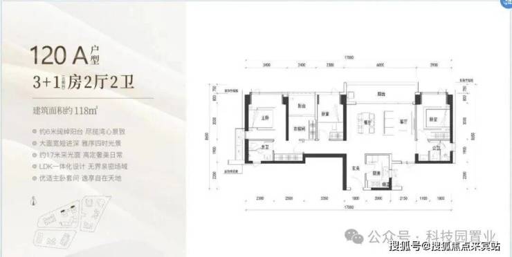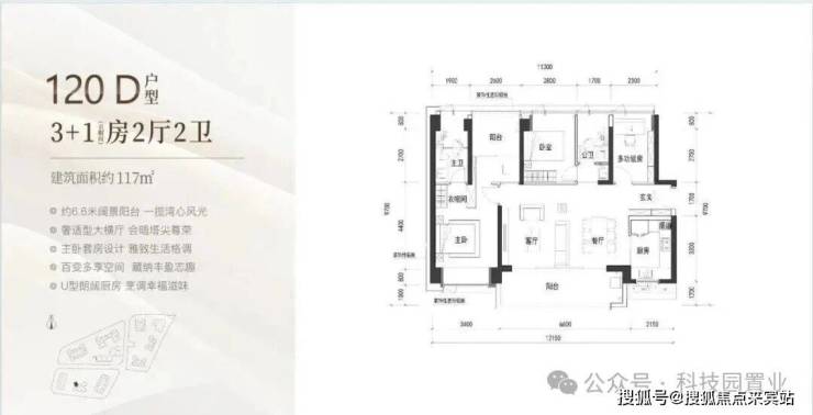 120㎡:客厅与卧室连通9.6㎡超大阳台,主卧带5.2㎡衣帽间,还有观景小阳台,主要为东南和西南朝向