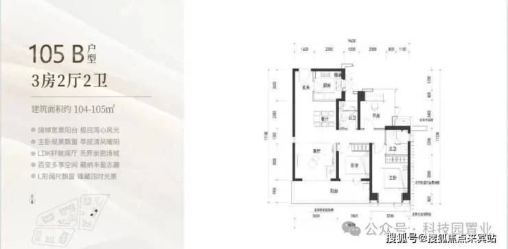 105㎡: 竖厅格局,客厅与卧室连通超大阳台,LDK一体化设计,主卧室270度转角飘窗,看城市景观,主要朝向为西南和东南