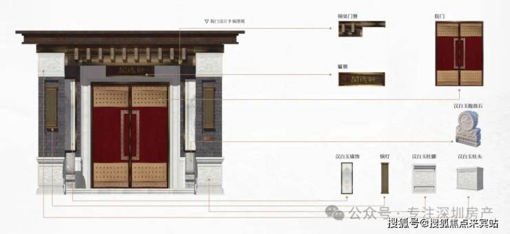 宅,以门户为冠带。无论是王室宫殿,还是世家府邸,门庭规制始终都渗透着礼序等级之道,代表威望所在。深圳院子的门头体系设计灵感来源于皇家王府官宅门头,礼序威仪,宏伟气派。一道门一重礼,用一院宅门威仪,传承着千年归家文明史。
