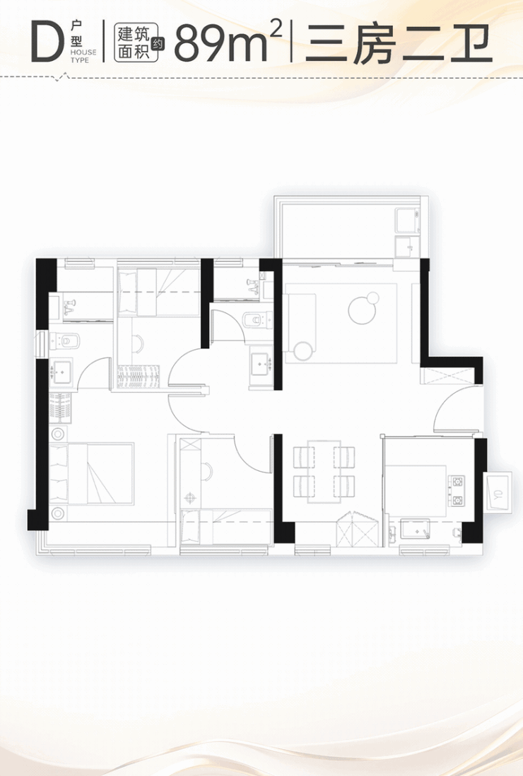 建面约89㎡D户型,公区LDKB一体化,U型厨房利用飘窗位,提高了实用率,洗、切、炒、盛的动线也很清晰合理。