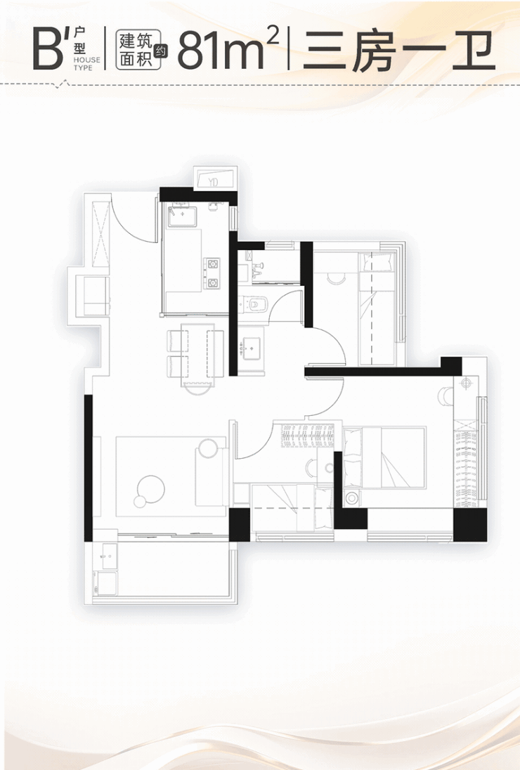 建面约81㎡三房一卫,有两个户型,都是竖厅设计。