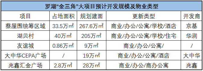 项目所在区域内布局了由知名品牌开发商主导的多个大型旧改项目,包括京基的蔡屋围统筹更新、华润的湖贝旧改、大中华的世贸中心、兆鑫的汇金广场以及友谊城等。