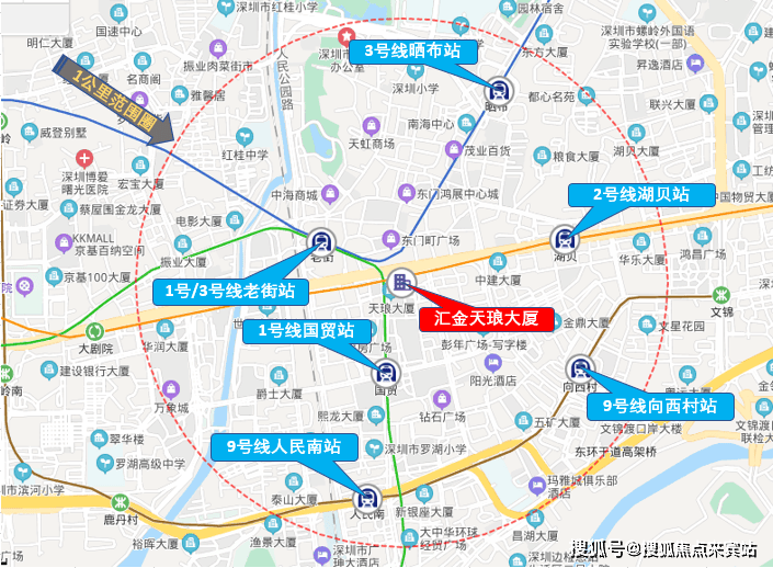 交通:轨道交通方面,项目1公里范围内有7个地铁站,可直接通勤深圳地铁1号、2号、3号、9号线四条地铁线路。距离老街站,国贸站步行距离均在500米范围内,其它几个地铁站距离稍远,需要借助其它交通工具通行。
