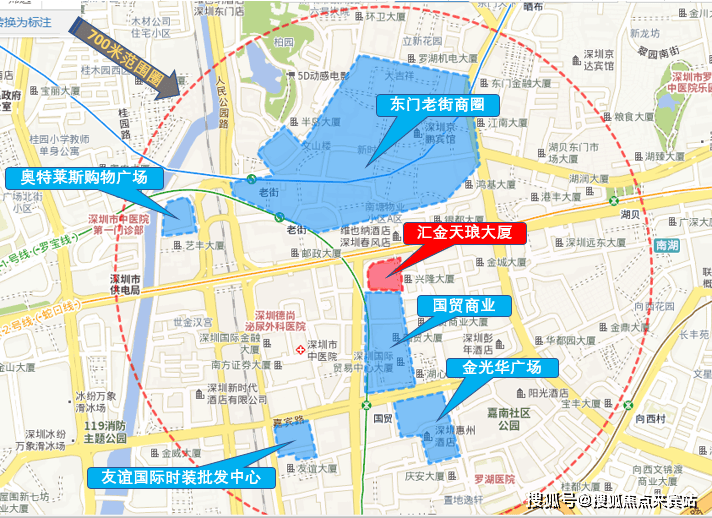 商业:项目所在区域是罗湖的核心位置,更是罗湖最核心商圈,周边商业环境非常好,也运营的很成熟。除项目附近分布的临街商铺外,项目700米范围内分布有国贸商业,老街商圈,金光华购物广场,奥特莱斯购物广场,友谊国际时装批发中心等大型集中式商业,商业的便利和优质程度都非常高。