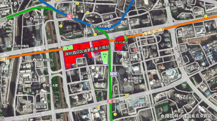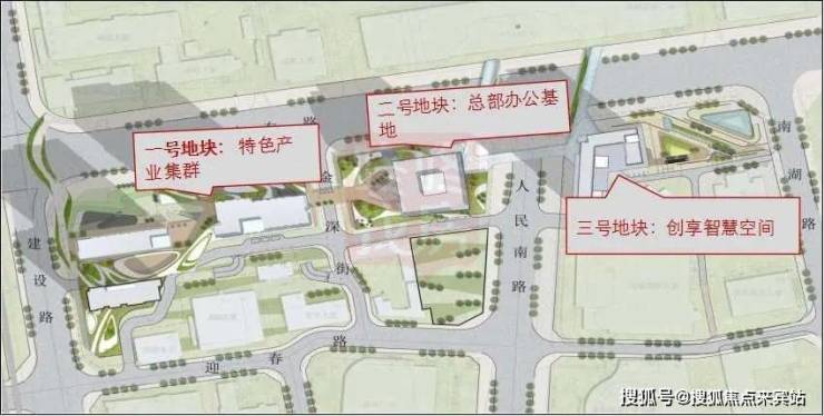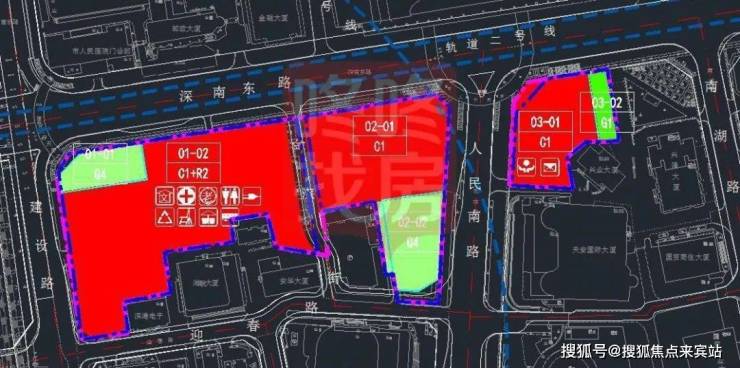 项目紧邻城市主干道深南东路,西邻建设路,东邻人民南路,南邻迎春路。项目用地面积约2.6万㎡,建筑面积约28万㎡,计容积率建筑面积约22.2万平,其中其中办公约13万平,商业约4.7万平(地下约2.52万平地下商业不计容),商务公寓约5.2万平,公共配套约6900平。项目共分三部分开发:一号地块拟建特色产业用房,二号地块拟建总部办公大楼,三号地块拟建创享智慧空间。
