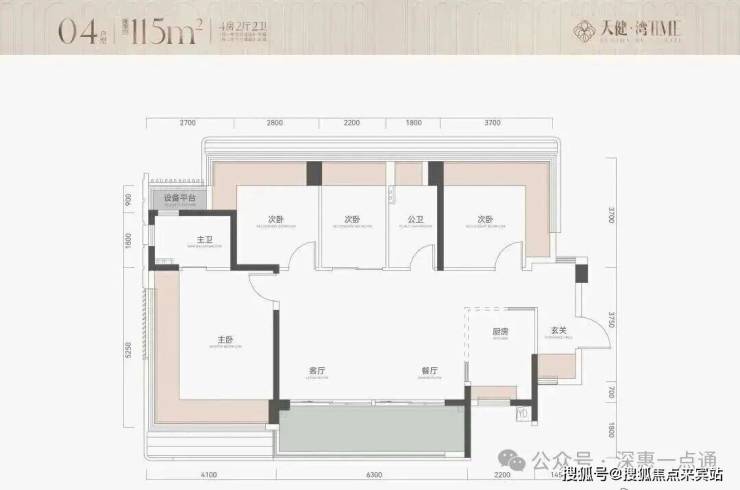 115㎡的4房2厅2卫,设计的是横厅南北通透格局,进门可做800库玄关,客餐厅6.3米开间,LDKB一体化,五开间朝南,分别做到了主卧21.52㎡/次卧13.69㎡/次卧11.88㎡/次卧8.14㎡(包含墙体飘窗),U型厨房,主卧卫生间带1个设备平台约1.71㎡,得房率约81%(不含赠送),客厅连接餐厅出6.3米长的大阳台约11.34㎡,西南朝向。套内面积93.15㎡+飘窗20.63㎡+阳台5.67㎡+设备平台1.71㎡=实得面积121.16㎡,加上赠送后得房率约105.36%。