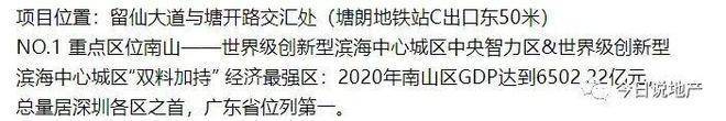 中央智力区&世界级创新型滨海中心城区“双料加持” 经济最强区:2020年南山区GDP达到6502.22亿元,总量居深圳各区之首,广东省位列第一。