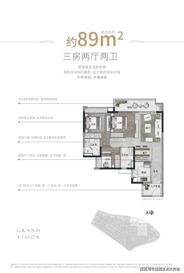 金牌上车三房 89㎡三房两厅两卫,约5.8米阔景阳台,观景、家政各有分区,主卧独立套房,私享自在天地,餐客厅一体,聚乐家厅欢乐满满。