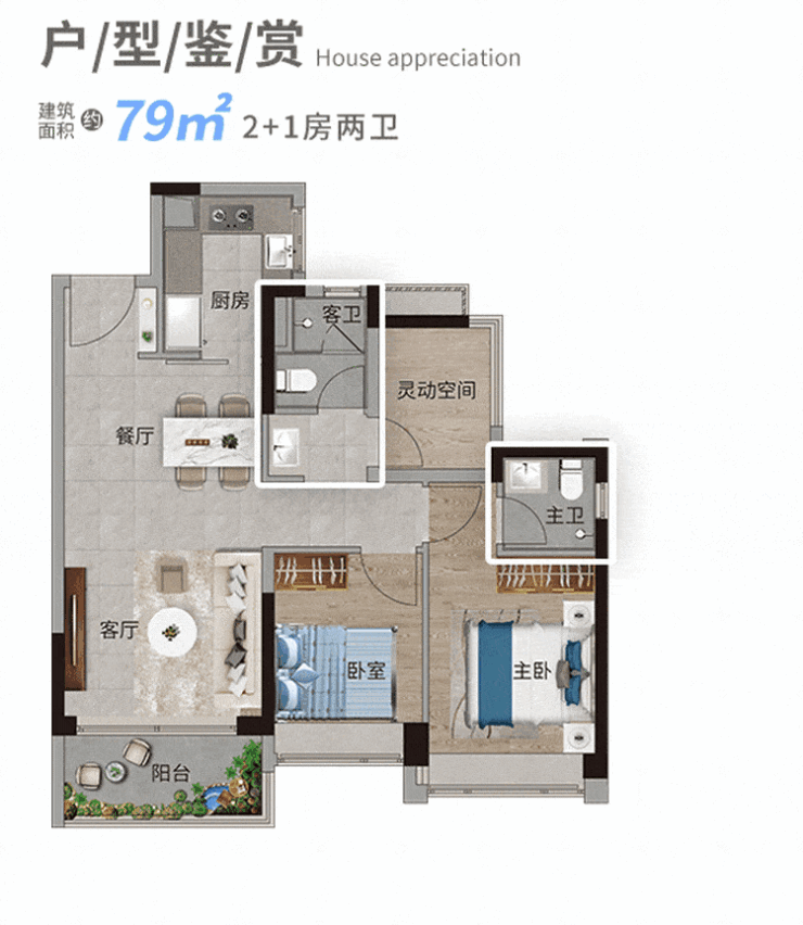 户型:79㎡、86㎡、102㎡三房两卫-四房两卫