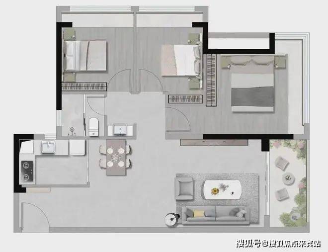 设计的是竖厅格局,客厅3.8米开间,LDKB一体化设计,三开间朝南,3个卧室分别做到了3.2米/2.7米/2.7米的宽度,其中1个次卧可以做多1个房中房,客厅连接次卧出6.5米长的大阳台,U型厨房,卫生间干湿分离,