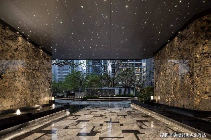 楼栋入口更别具心裁地采用金属拉丝天花板搭配石材墙面,结合镂空与金属装饰,拉满归家仪式感。这样的格调,完全不输四季、瑰丽等顶奢酒店!