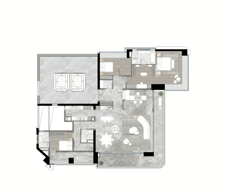并且,该户型还能进行灵活的个性化空间定制。例如大端厅可以根据家庭不同阶段的居住需求,拆解成不同功能空间。更能适应高端人群多样化的生活追求。