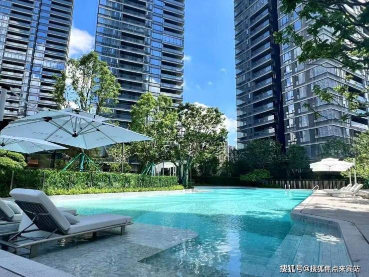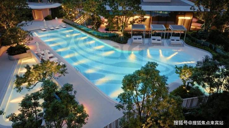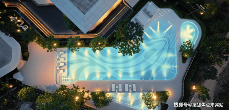 环绕式叠瀑水景,超50米L型泳池,1888㎡泛泳池区域,汇聚休憩亭廊、标准池、水疗按摩泳池、儿童池、休闲泳池等功能,搭配亚热带绿植,将顶级度假酒店的松弛感搬进日常。