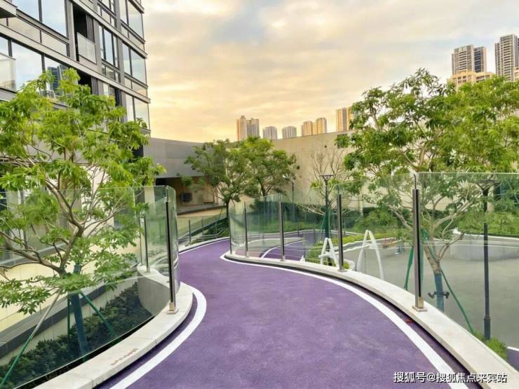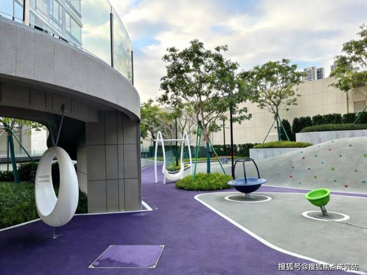 地面采用epdm材质,采用紫色与灰色的经典配色,周边种植风铃木乔木,加上各个款式的游乐设备,让玩趣空间增加更多乐趣,更契合高端住宅的典型配置。