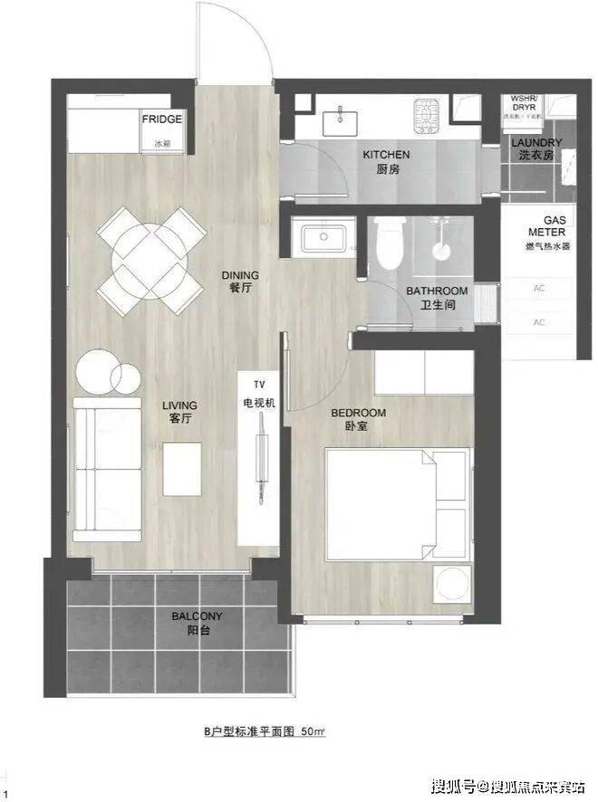 50㎡1房,带生活阳台,传统一房一厅布局。前海东岸