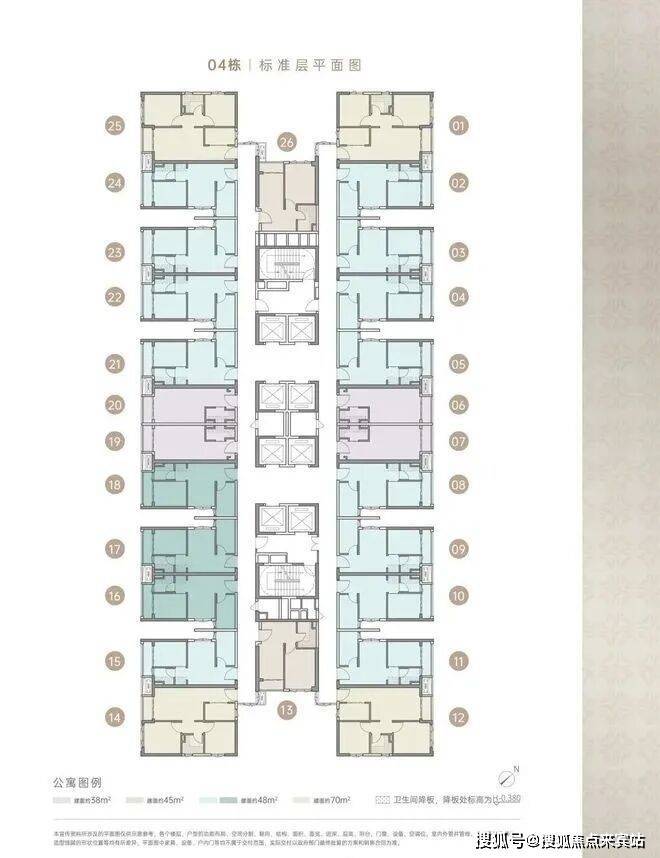 住宅由4栋48层建筑组成(1栋、2栋1/2单元、3栋),规划3梯5/6户;4栋为45层商务公寓,共1470户;5栋为幼儿园。住宅总户数1011户,其中回迁住宅609户(面积61507㎡),可售住宅402套(面积38783㎡),回迁占比约6成,居住纯度一般。
