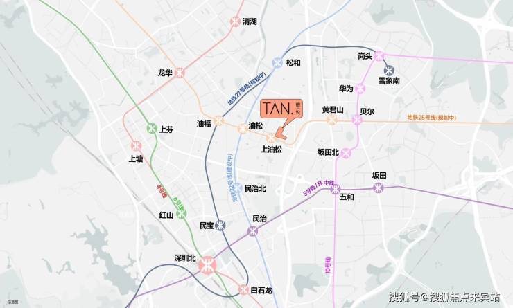 檀悦离规划中的地铁 25 号线(一期)上油松站,直线距离大概 100 米。而且 25 号线还能和 4 号线、22 号线、27 号线(这几条也在规划中)换乘,每站都能换,坐地铁去南山深圳湾超级总部基地、福田 CBD、坂田华为基地、罗湖这些核心区都很快。