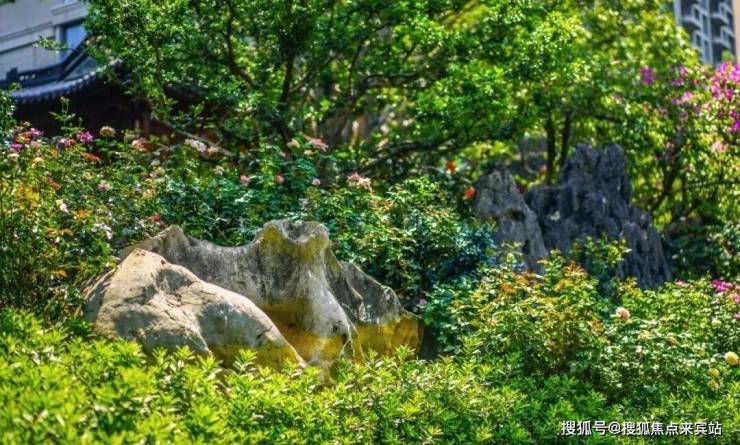 数十块造型奇特的景石营造延绵山脉的效果,配合全冠移植的超大乔木,姿态各异的花卉与植被,浓缩成“千里江山尽在此园”的意境