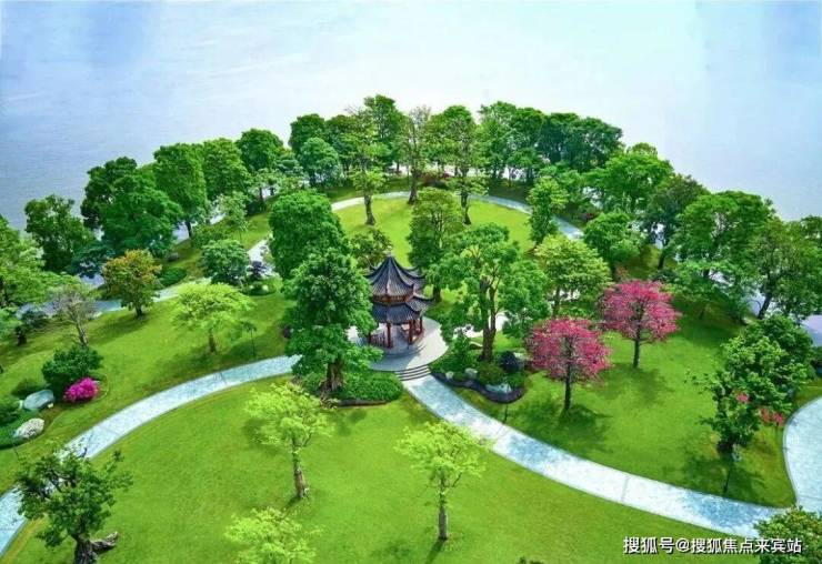 宏伟大气的绿岛与一线江景,形成一幅深邃意境的山水画,宛如千里江山图般壮阔