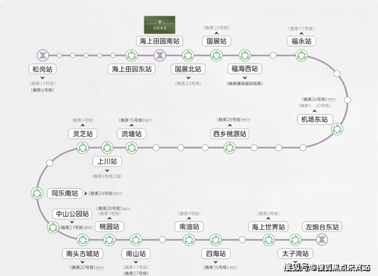 <交通>:快速通达南山中心、太子湾、宝安中心、科技园、福田CBD等区域。20号线二期(白石洲-机场北)计划2028年通车;