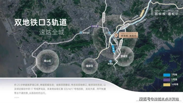 直线距离约500米的百鸽笼站是5号线和规划中17号线的换乘站,17号线(规划中)已经在深圳地铁五期规划中公示,预计2025年通车,线路直达罗湖口岸;另一端布吉站是3号线、5号线和14号超级快线的换乘站;同站点深圳东站为高铁站,通达全城。