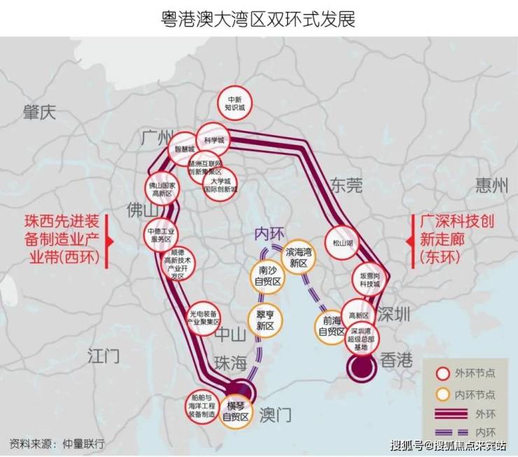 广深港澳科技创新走廊——以番禺国际创新城为纽带起始核心,串联大湾区东西两岸重要节点城市形成双环式产业带。