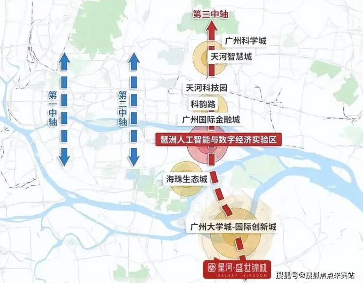以中新知识城和南沙科学城为极点,落位国际创新城,汇聚国际一流人才资源、科技基础设施、高等院校、科研机构和科技型企业,如思科、韩国LS、探迹、小鹏汇天、广汽埃安等头部独角兽企业已相继进驻,带动第三中轴科技创新产业发展,未来产值将超万亿GDP。(数据来源:广州日报)