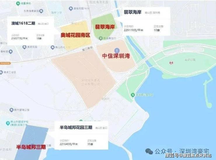 从价格来看,距离中信深圳湾目最近的小区:翡翠海岸、半岛城邦花园三期、恒裕滨城等二手房挂牌价均在22万/㎡左右(来源于贝壳),甚至巅峰期价格一度到达30万+/㎡。