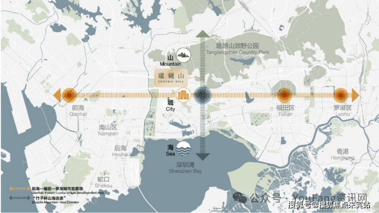 ①中心区域:深圳山海城中轴,左手香蜜湖、右手华侨城,六大总部基地环伺