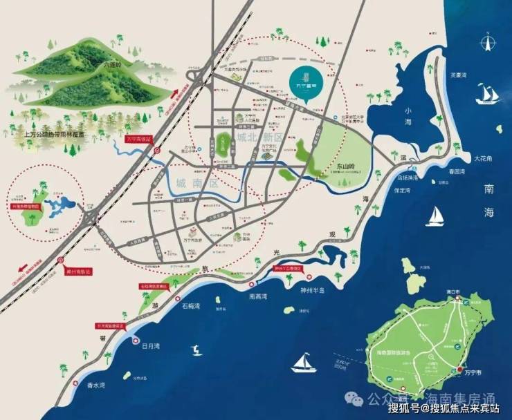 项目位于万宁主城区,城市主干道望海大道中段,距环岛高速3公里,仅需8分钟可至万宁高铁站,距博鳌机场约40公里,三亚机场约120公里,海口美兰机场约140公里。万宁境内万洋高速,连接东西海岸线,快速连接琼中、儋州,月50分钟迅速通达全岛。