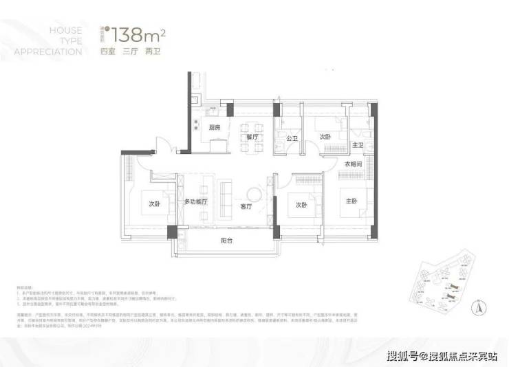 竖庭格局,西南向,基本居住功能与建面约108-110㎡4房2卫一致,但格局不一样,从目前公布的户型图上看,主要是主卧空间有了更大的提升,比如可以放更大一点的衣柜。但从位置上看,它所在的楼栋更靠近主干道,会有噪音影响。