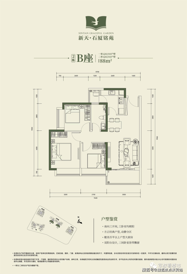 🔸2栋B座一单元02、03户型、2栋B座二单元02、03户型:面积约为88㎡的3房2厅1卫;
