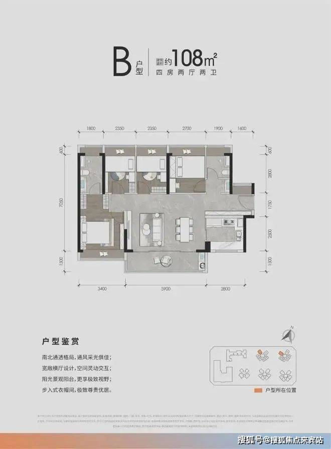 :横厅布局,客厅开间5.9-6.6米,南北通透,主卧套房设计;