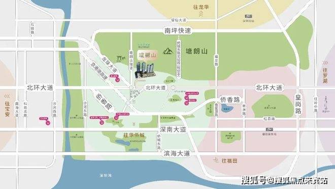 大沙河公园、华侨城湿地公园、园博园、儿童乐园、香蜜公园、梅林山公园,三山六公园环绕。