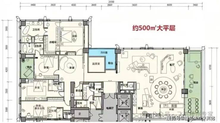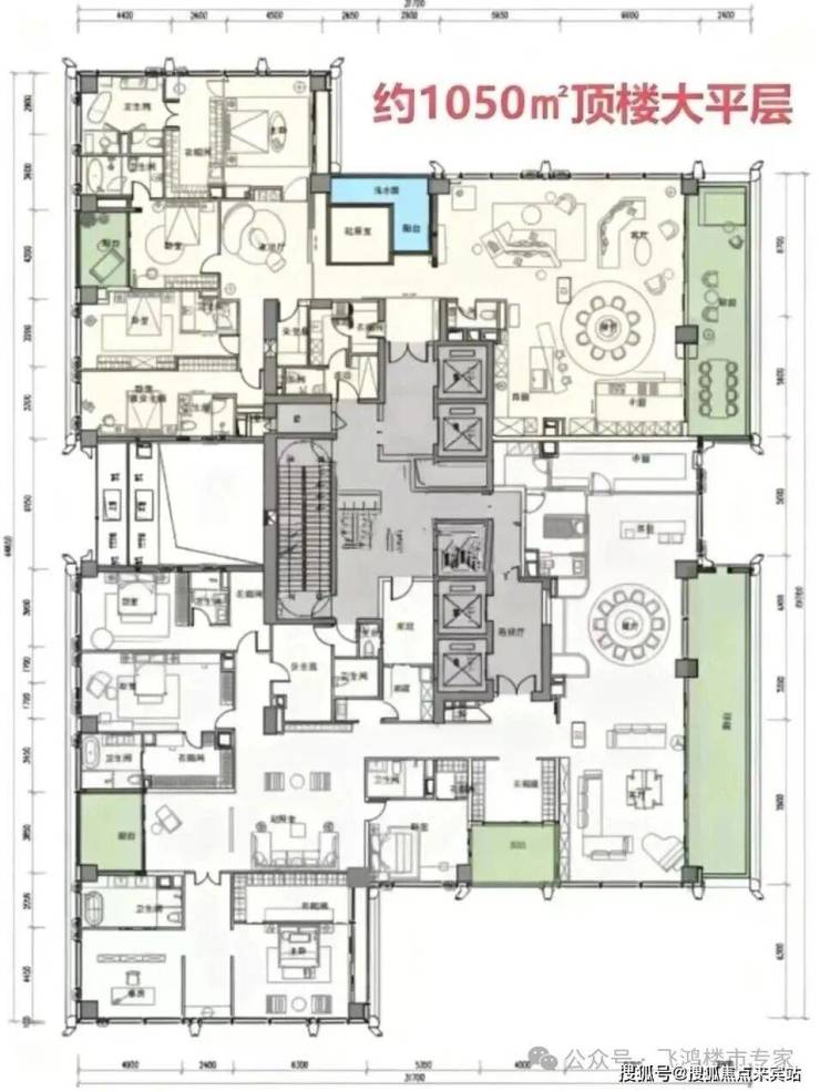 顶楼大平层,空间奢阔程度堪称 “空中别墅”,是顶级居住体验的代表。整体布局大气磅礴,功能分区精细且丰富:包含多间套房式卧室,每间都配备独立卫浴与专属空间,充分保障居住私密性与舒适感;公共区域十分开阔,超大客厅与餐厅相连,能轻松承载家庭聚会、高端社交宴请等多种场景;同时设置了多个特色功能区,宽敞的观景阳台可俯瞰绝佳景观,为生活增添惬意;家政、储物等辅助空间也很充足,让大宅生活既显奢华尊崇,又能井然有序,全方位满足顶级居住与社交的多重需求。