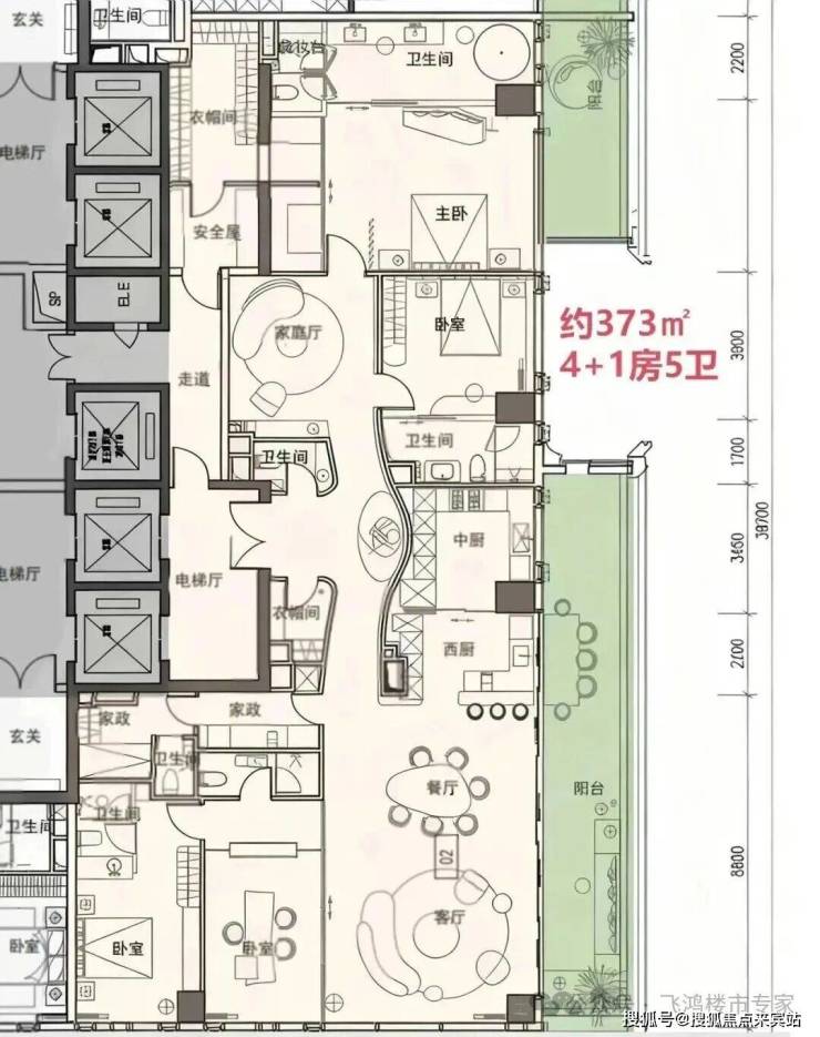 第二层是高区的 “天际视野层” ,位于约150-200米的高度,主力户型为建面约370-403平方米。这里的格局更为开阔,以建面约375平方米(东南向)户型为例,其客厅拥有近6米的横向开间,而最引人注目的是约14.45米面宽的超大阳台,足以将深圳湾的壮阔海景与城市繁华尽收眼底。