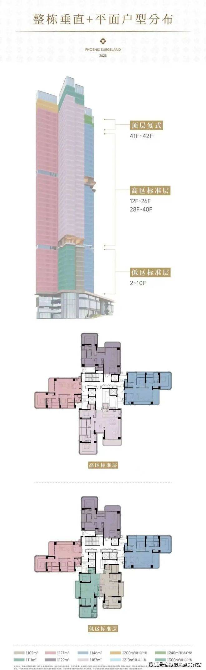 产品面积段:102-146㎡舒居户型 + 187㎡阔绰户型 + 200-300㎡顶复产品