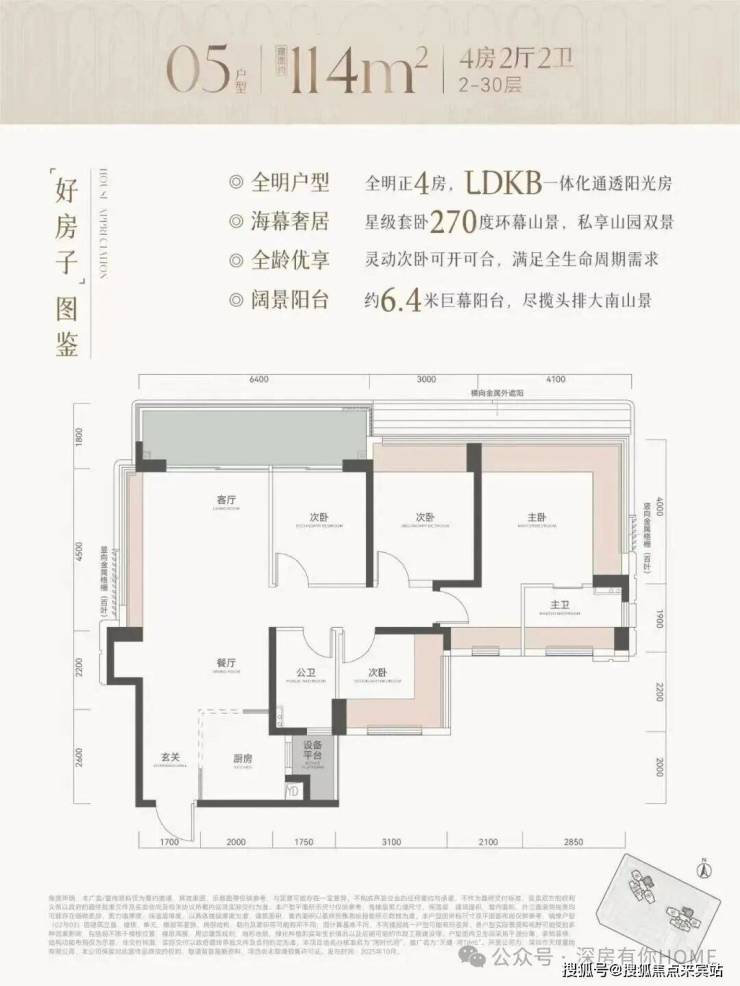115㎡四房:横厅+餐厨一体,三面采光,几乎无过道浪费,飘窗全屋配置;
