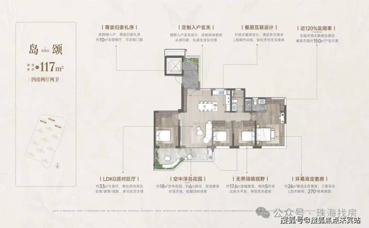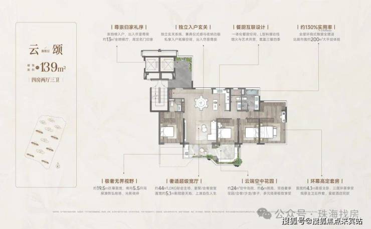 四代洋房·奢享写意人生 | 双入户大堂、一梯一户,稀缺至高约130%实用率(不含电梯厅),6面朝南,270°环幕采光,定制约6m错层空中浮岛,奢享墅质生活
