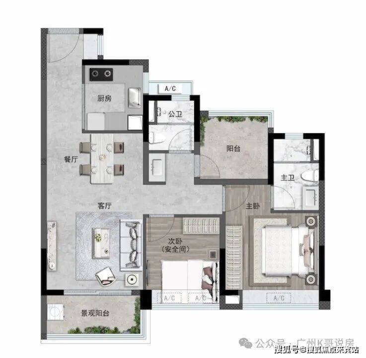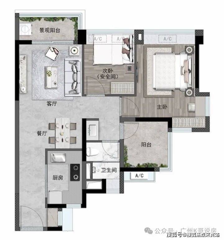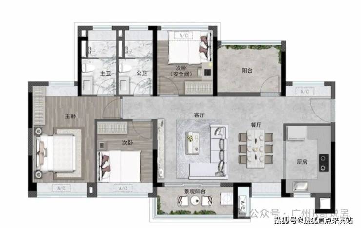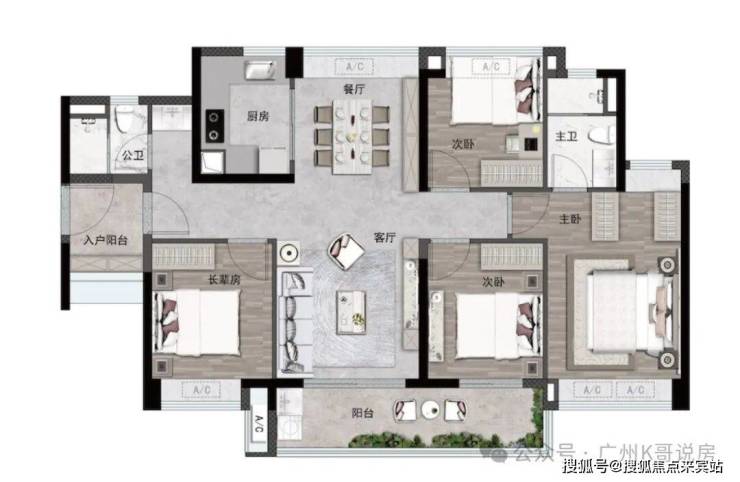 全屋多达6处飘窗赠送,主卧正面飘窗+转角飘窗、玄关飘窗、次卧飘窗、公卫飘窗