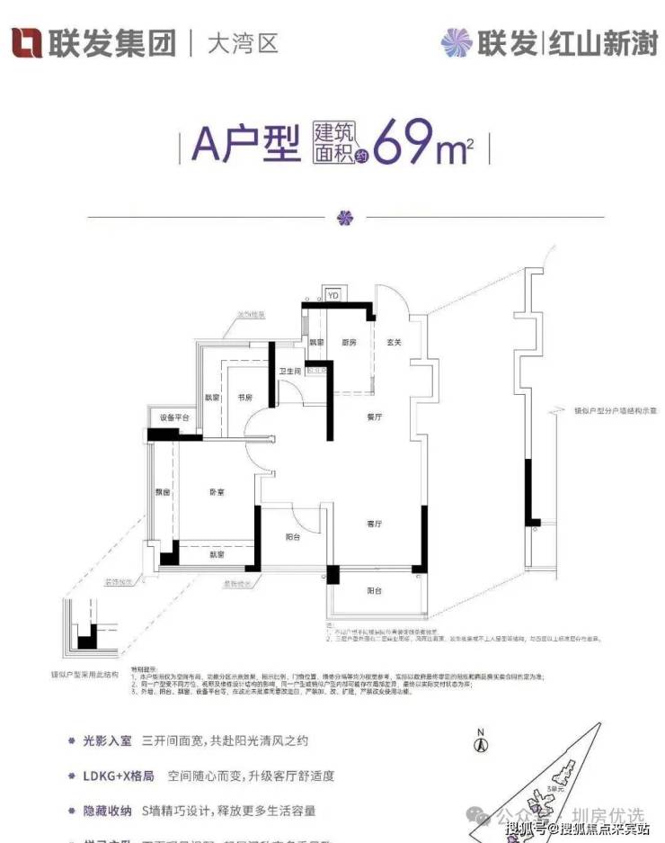 约69㎡的2+1房2厅1卫,设计的是竖厅LDKG+X格局,S墙设计预留冰箱卡槽位,做到了主卧双飘窗,三开间朝南,动静分区,U型大厨房,厨房烟道还做了外置空间,可以更好的利用厨房空间,卫生间三段式干湿分离。赠送了双阳台一半面积+5面飘窗+1个设备平台,超100%得房率,西南朝向。这是整个红山板块上车门槛最低的3房。