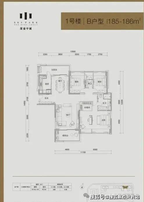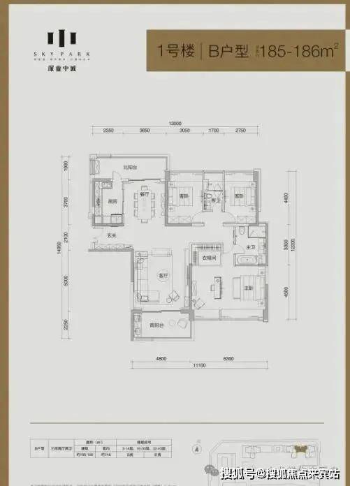 B户型:185-186㎡3房2卫,套内面积约146㎡,动静分区,南北通透双阳台,北向可看香蜜公园景观。
