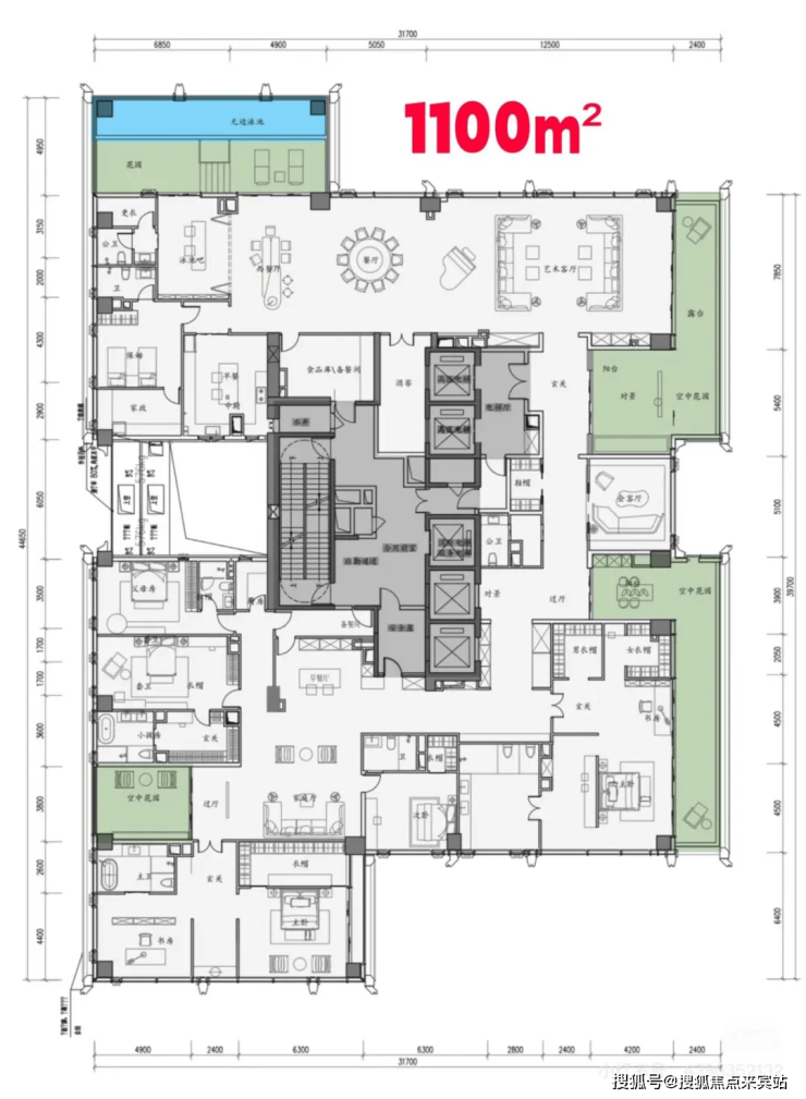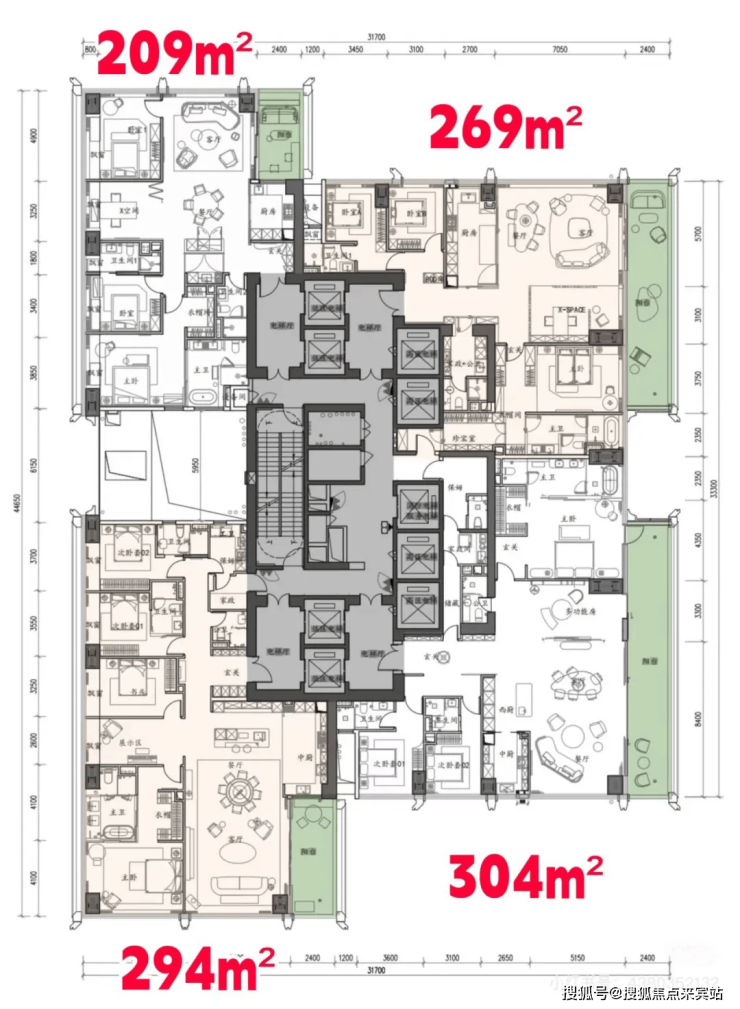 超高区(200米以上)及顶楼:500-1050㎡顶级大平层,提供总统级居住体验,如独立电梯厅、双主卧套房、270°观景客厅等。